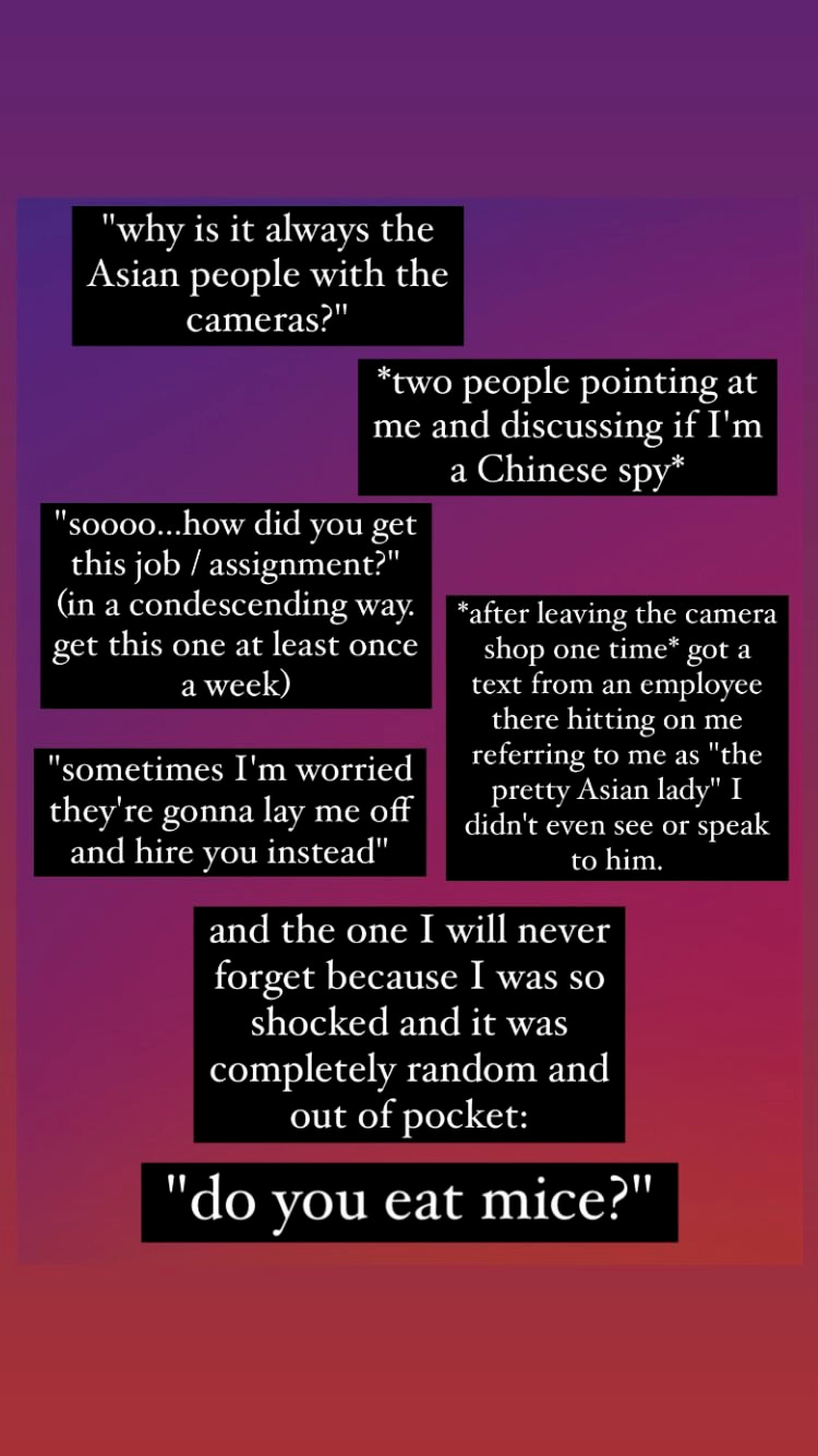 A few weeks ago I posted some experiences I’ve had working as a photographer who is also a Chinese American woman (see below).